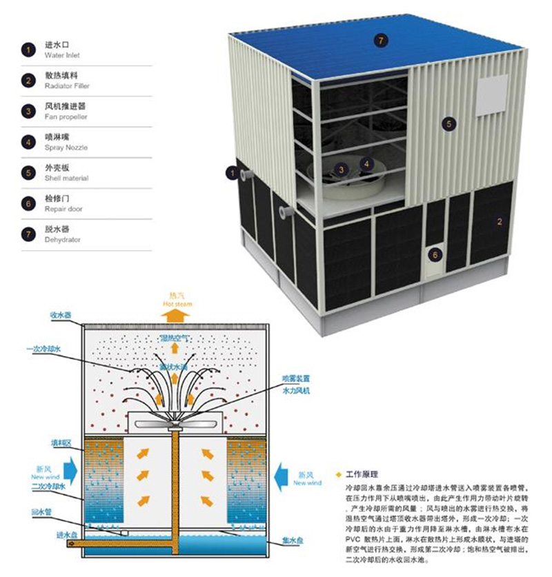 無填料噴霧式冷卻塔是我公司根據中國機械部第四設計院設計產品,深度開發的一種節能的新型冷卻塔。特點是取消了冷卻塔填料和電機風機,采用水驅動霧化器旋轉帶動風能,達到與填料塔相同的散熱效果,使用戶的生產成本大大降低。
